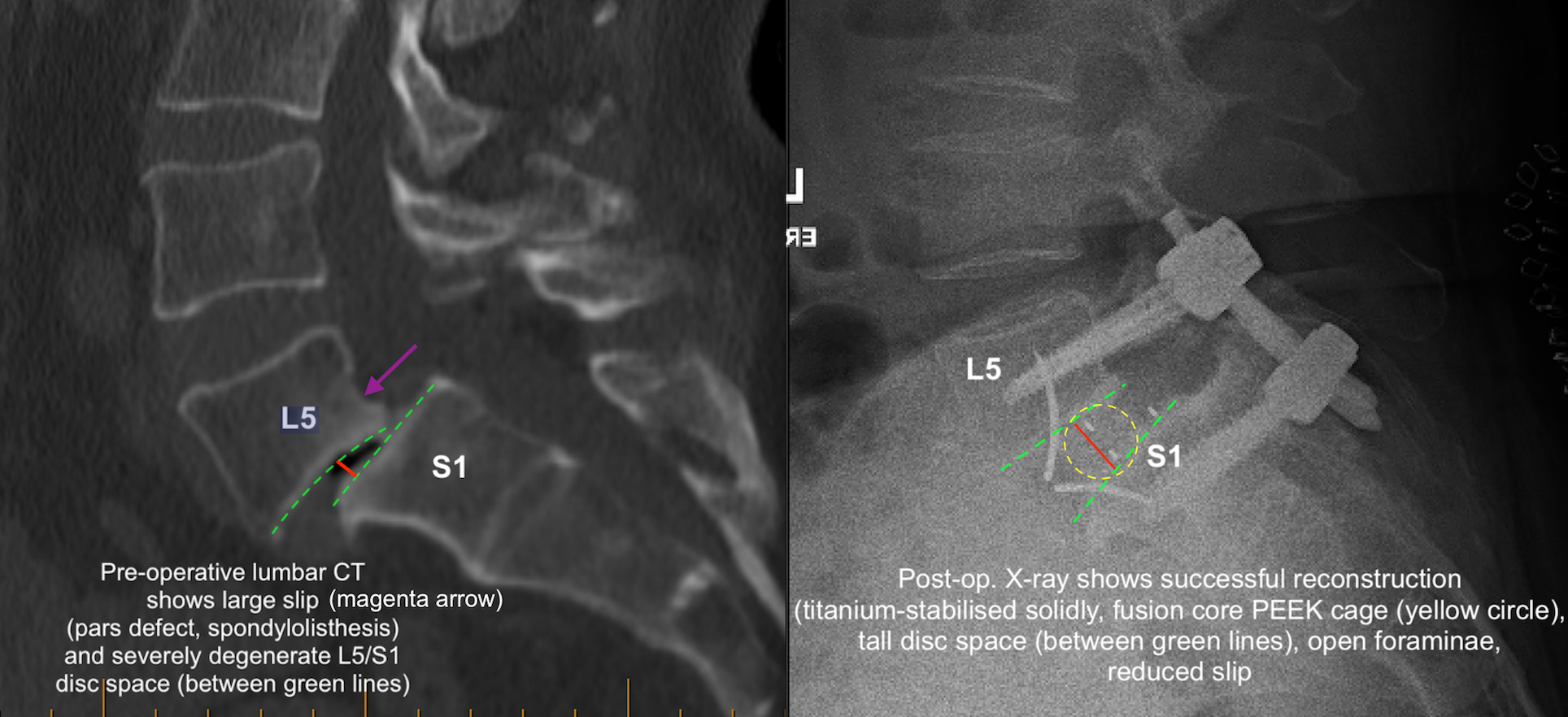 If there is a congenital (developmental) defect of a posterior stabilising structure of the spine called the pars interarticularis, then a spinal slip (spondylolisthesis) can arise from this “pars defect“. It usually becomes apparent in a person’s 30s to 40s, as the symptoms of low back pain +/- leg symptoms become more apparent and progress. Imaging then shows what the cause is (CT scan image below):