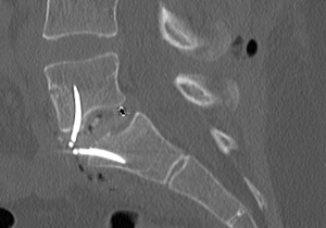 This patient was recently referred for ongoing symptoms of low back and leg pain following a procedure done by someone interstate. The construct (posteriorly placed instrumentation comprised of screws, hooks and rods) had failed to stabilise the spine or resolve the symptoms.
